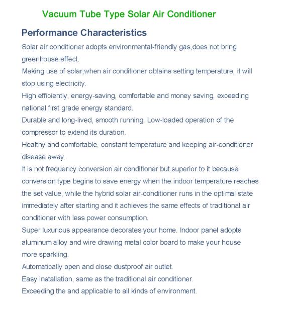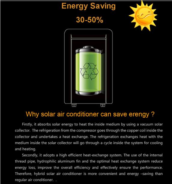 In sunshine time ,the vacuum tube can absorb the sunshine to heat the water of the water tank, then the hot water will translate the heating to refrigerant by the exchange, then help the compressor heat the temperature and increase the pressure of the refrigerant again,so it just need use the small compressor driver the system running, just use the less power to cool or heat the room,to save more energy.