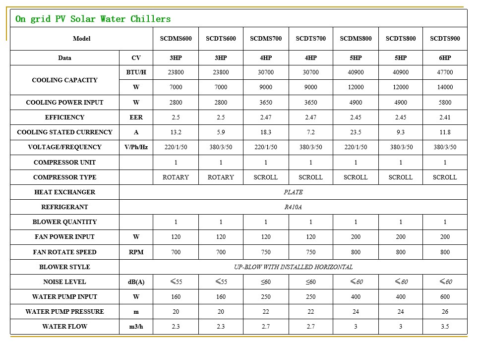 When in sunny day, the solar panel can provide the power together with on grid electricity power to provide to water chiller for start running, when it running stable, the water can running just with the power from solar panels if 4 panels, so it no need any electricity at this time.